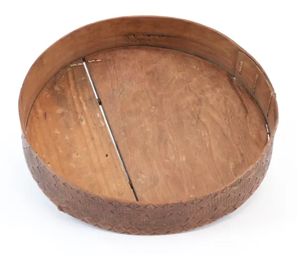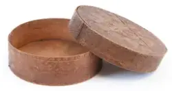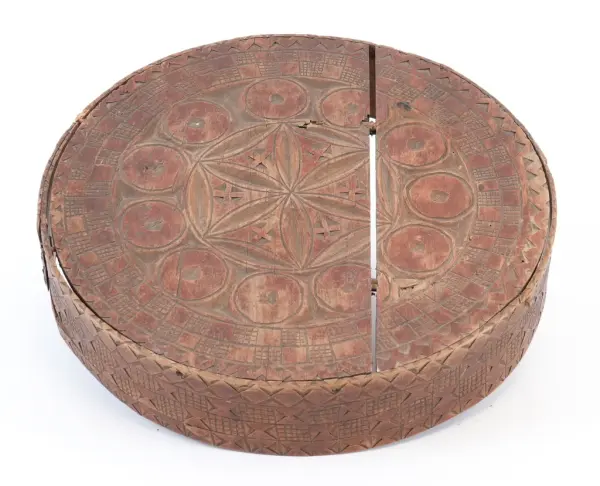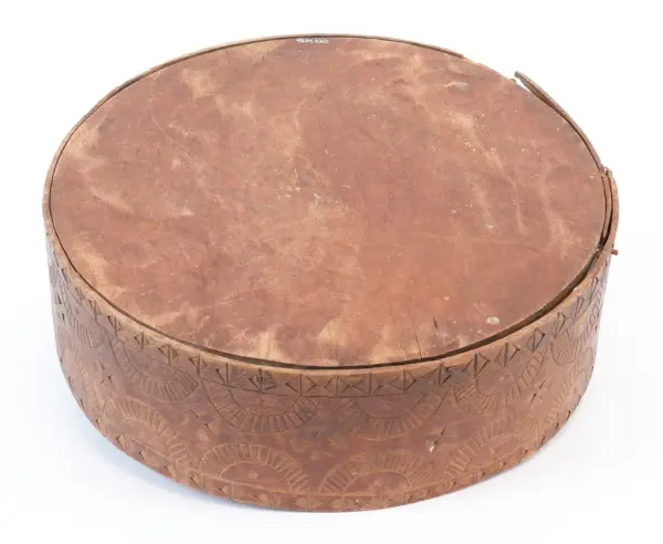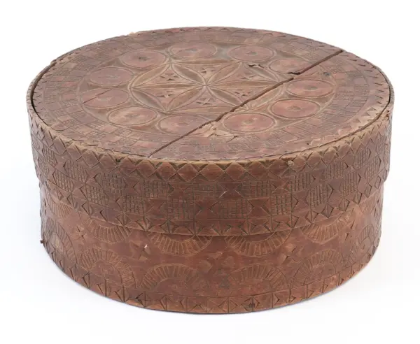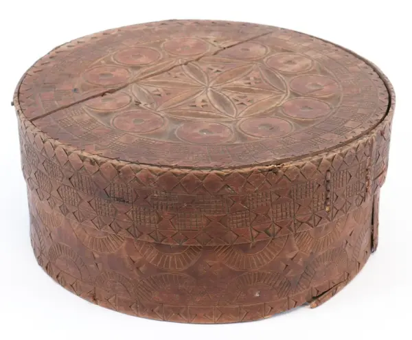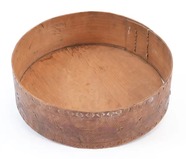 about Rund, sveipa øskje laga av tre med avtagbart lokk. Sideveggen sydd samman med tæger. Toppen av lokket og botnen festa med trenaglar som settes gjennom små hol i sveipen. Den heile øskja dekorert med utskore ornament (seksbladrose, muruspjeld, sikksakk, halvsirklar, krysskors), beisa brent sienna. Innvendig umåla.