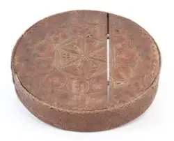 Subject Karveskurd over heile øskja. På toppen av lokket ei sentral seksbladrose innskriven i ein sekskant med konkave sider, alt i ein sirkel. Mellom roseblader utskorne krysskors. Rundt rosa ei brei stripe med utskorne sirklar. Rundt dei, eit maskulint muruspjeld og sikksakk langs kanten. På sideveggen av lokket dobbel sikksakk langs kanten og muruspjeld med vekslende felt (rutenett og ståande timeglass symbol). På sideveggen av behaldaren, langs kantane stripar med ståande timeglass symbol. Mellom dei halvsirklar og krysskors.