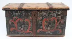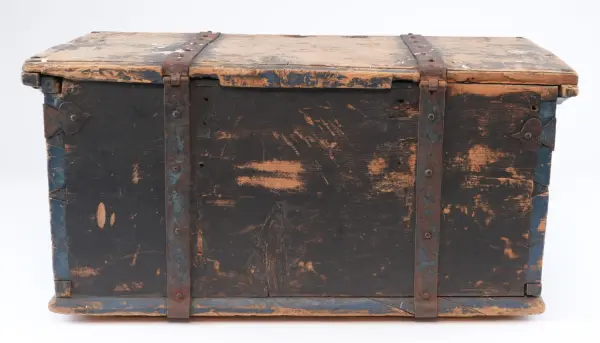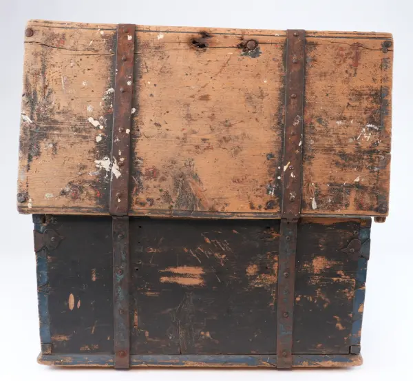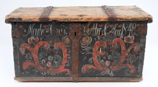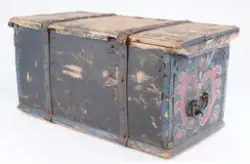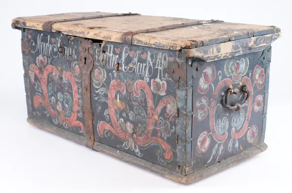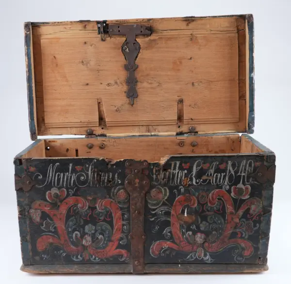 Kiste laga av furu. Horisontal kuboid form avsmalnande nedover med flatt hengsla lokk med profilerte sider. På lokket to jernbeslag i form av striper som er forlengde på baksida og ender under botnen. I midten av forsida ei stripe av jernbeslag med nøkkellås. Låsen på innsida er vekk, i stedet for påsette to hengelåsbeslag: til ... Kiste laga av furu. Horisontal kuboid form avsmalnande nedover med flatt hengsla lokk med profilerte sider. På lokket to jernbeslag i form av striper som er forlengde på baksida og ender under botnen. I midten av forsida ei stripe av jernbeslag med nøkkellås. Låsen på innsida er vekk, i stedet for påsette to hengelåsbeslag: til venstre ei hempe for hekte i lokket, til høgre manglar begge to (synlege hol etter hempe). Øvst i kvert hjørne eit lite jernbeslag. To kraftige ovale handtak på kortsidene. Inni til venstre spor etter leddik. Frå utsida rikt dekorert med rosemåling og stor inskripsjon. Oppå lokket er målingen slitt vekk.