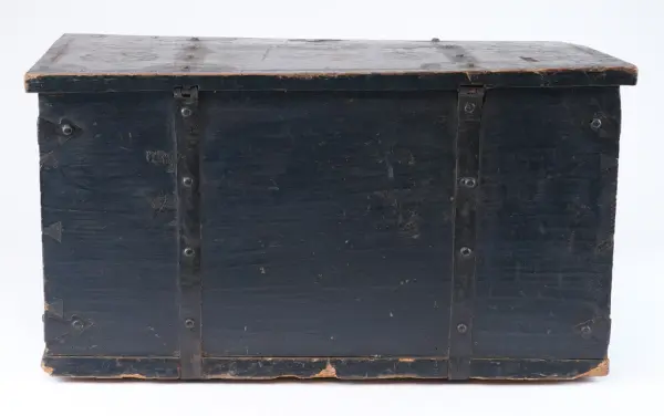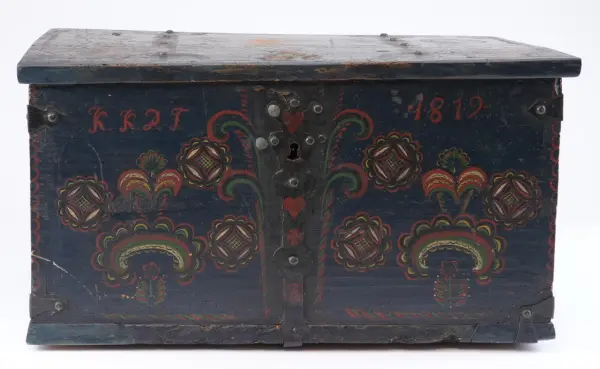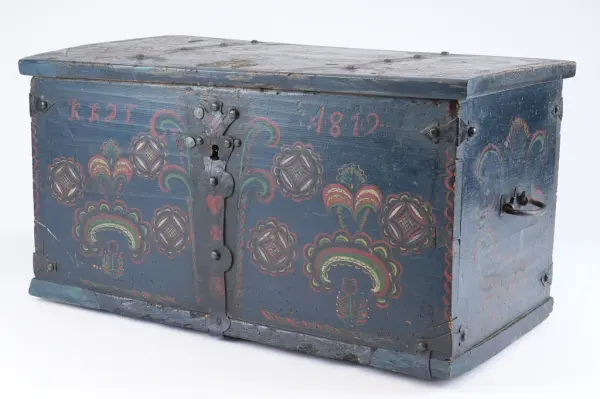 Viksdalsmåling. På svart bakgrunn måla raude, grøne, gule og kvite blomstrar, blad og s-kurver. På lokket måla med raud linje tre arkitektoniske inndelingar (2 smale på sidene, 1 brei i midten) understreka horisontalt med bord av små kvite prikkar og vertikalt med grøne s-ar. Inni inndelingane måla typiske for folkekunst blomstrar. Motiver frå folkekunst gjentatte på forsida. Låsbeslaget med måla på raude hjerte, kors og fiskegarn og med omriss av små grøne og raude s-ar og voluttar som stikk ut. På kortsidene enklere ornament av s-ar med bladverk.