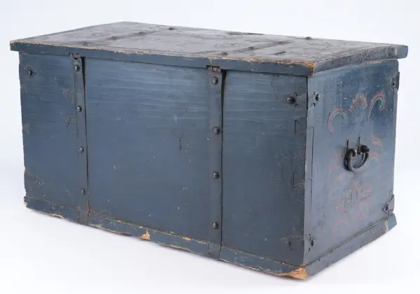 Kiste laga av furu. Horisontal kuboid form med flatt hengsla lokk. Frå innsida av lokket to jernbeslag i form av striper som er forlengde på utsida av baken og ender under botnen. I midten av forsida ei dekorativ stripe av jernbeslag med nøkkellås. I kvert hjørne to små jernbeslag. På kortsidene to ovale handtak. Frå utsida rose... Kiste laga av furu. Horisontal kuboid form med flatt hengsla lokk. Frå innsida av lokket to jernbeslag i form av striper som er forlengde på utsida av baken og ender under botnen. I midten av forsida ei dekorativ stripe av jernbeslag med nøkkellås. I kvert hjørne to små jernbeslag. På kortsidene to ovale handtak. Frå utsida rosemåla i Viksdalsmåling med raud inskripsjon på fronten. På innsida av lokket er kistebrev (kleba fargetrykk med bibelske motiv). Inni tillaga til leddik.