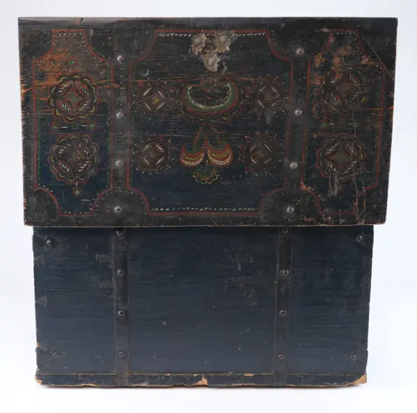 Viksdalsmåling. På svart bakgrunn måla raude, grøne, gule og kvite blomstrar, blad og s-kurver. På lokket måla med raud linje tre arkitektoniske inndelingar (2 smale på sidene, 1 b...