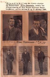 Høten 1908 ble Elias Tønnesen arrestert i Bergen og overført til Skien kretsfengsel. Natt til 9. mai 1909 gjennomførte han og medfangen Otto Fjeld en meget spektakulær rømming. Tønnesen fikk revet løs en rist i ventilen i cellen, brukte den som brekkjern og fikk brutt opp sin og Fjelds celledør. Om morgenen overfalt de slutteren, sikret seg klær og fengselsnøklene, låste seg ut og satte til skogs. Alt disponibelt politi i søndre Vestfold og nedre Telemark jaktet på rømlingene, som kom seg unna til fots, i robåt og i seilbåt. Tønnesen ble arrestert i Sverige i juni. Han var nå kjent i hele Norge. Alle landets aviser skrev om ham.