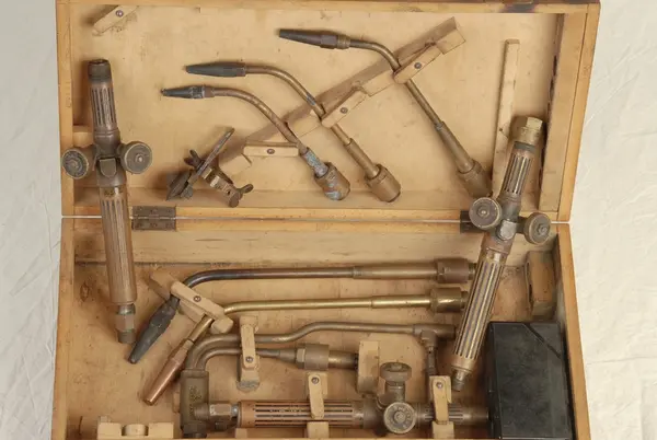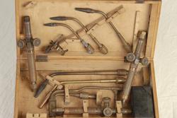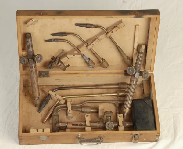 Koffert med sveisebrennere i 11 deler. 7 sveisebend beregnet til plater av ulik størrelse. En skjærebrenner, en førevogn og 4 dyser.