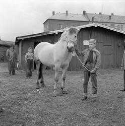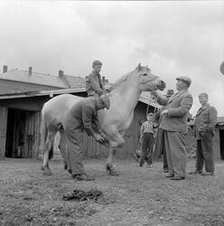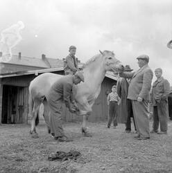 Den nye eieren, Erik Mattson fra Östersund undersøker hesten og sønnen Åke sitter oppå. Selgeren Ivar Sæther fra Hellesylt til høyre.