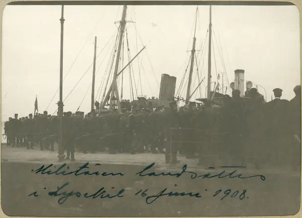 Text till bild: "Militären landsättes i Lysekil 16 juni 1908"