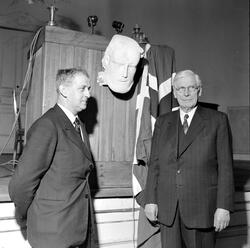 "Ved avdukingen av bysten av "Trønder.bonden" i Frimurerlogen i går. Bysten skal senere hugges i kleberstein og gis Jon Sundby som gave fra bøndene i Trøndelag. Fra venstre Bernt Forseth, som foretok avdukningen og til høyre Sundby.". (bilde 1-2)
