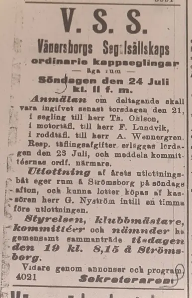I Elfsborgs läns annons blad annonserades den 19 juli 1910 att "Vänersborgs Segelsällskaps ordinarie kappseglingar äga rum Söndagen 24 Juli kl 11 f.m"