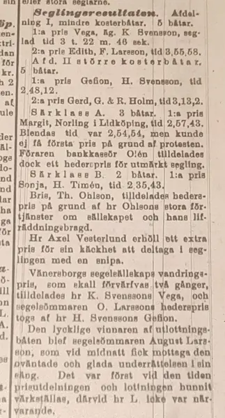 I tidningen som kom ut 26 juli står att: "Den lycklige vinnaren af utlottningsbåten blef segelsömmaren August Larsson, som vid midnatt fick mottaga den oväntade och glada underrätelsen i sin säng. Det var först vid den tiden prisutdelningen och lottningen hunnit värkställas, därvid hr L icke var närvarande"