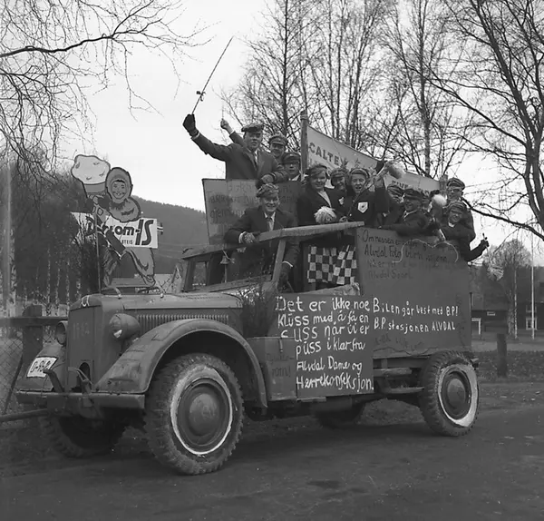 Bilen: Alvdals gamle brannbil, Horch 901, oppr. militærbil. Dens siste utrykning var til sjukehusbrannen på Tynset 6.8.1954, men fikk motorstopp underveis. Den gikk ikke for egen maskin og vart som russebil trukket med traktor (ser staget fra fronten). Russen malte bilen grønn.