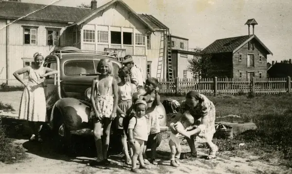 sted og med samme personer og bil, som https://digitaltmuseum.no/0210111760594/barn-og-voksne-foran-bil