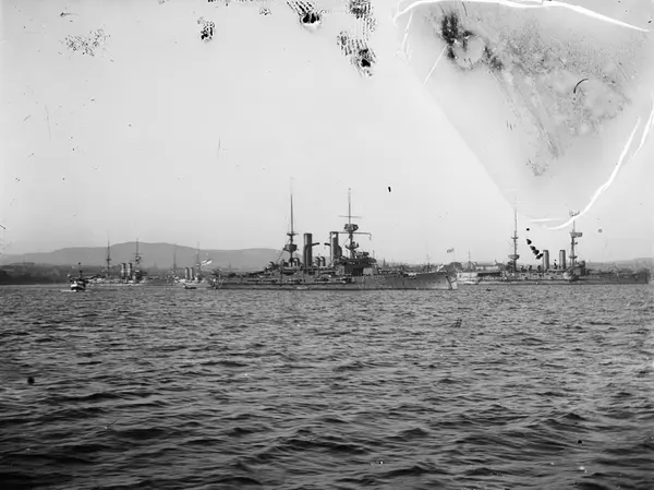 I forgrunnen, slagskipet HMS Swiftsure. Bildet er høyst sannsynlig