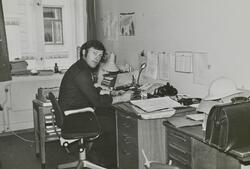 - Nils G. Skarning fotografert i laboratoriet ved Kripos, Victoria Terrasse, med vindu mot Kronprinsens gate
