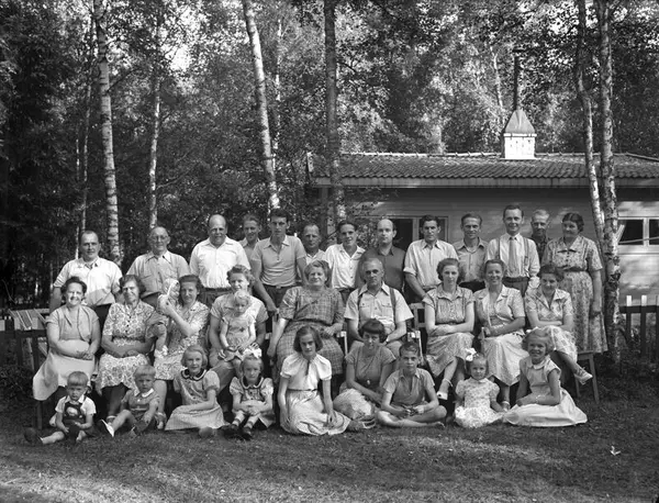Henrik Ward hälsar:"Jag kan bidra med några namn. Översta raden: Josef Johansson,?, Karl Johansson, Bertil Eriksson, Erik Hägg, Gunnar(Amandus)Johansson, Keve, Karl Svensson, Damm, Josef Nilsson, Arne Wärja, Martin Karlsson m fru. I mitten sitter Linnea och Anton Ward. Nedre raden i mitten sitter Alice, Berit och Rune Ward."