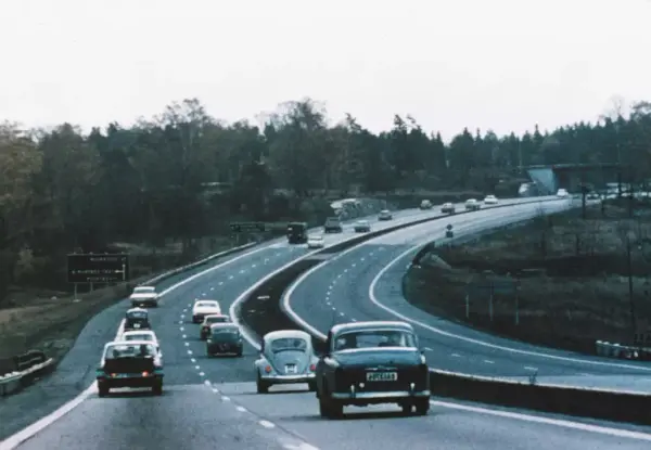 Spegelvänd bild. Täby Centrum och Viggbyholm står på vägskylten (som alltså ska vara på höger sida av bilden).