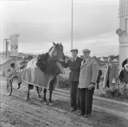 Bilde 15: Vinneren av K. N. Stensruds minneløp med Karl Trøan i sulkyen. Snøstegg gikk over distansen 2100 m. på 1,37,8.