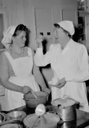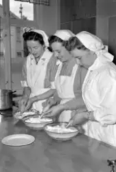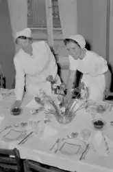 Arbeider-Avisa 03.06.1954 har brukt bilde 2 til venstre for bilde 6. Montasjen har følgende bildetekst: "Til venstre ser vi lærerinne Inger Domaas og Margrete Damhaug ta et siste overblikk over middagsbordet. De unge damene som pynter dagens dessert er (fra venstre) Ingebjørg Karlsen, Jenny Lyngvær og Svanhild Haave".