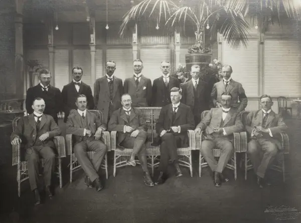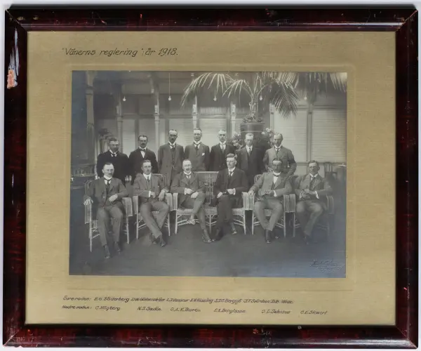 Inramat gruppbild som har prytt lantmäteriets lokaler i Vänersborg. Träff lantmätare som arbetat med förberedande åtgärder