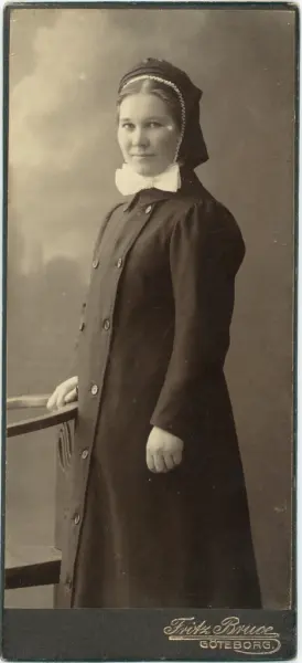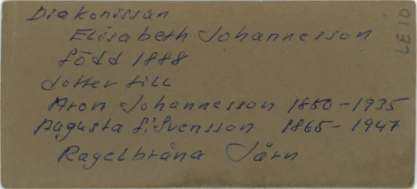 Text på baksida av fotografi: Diakonissan Elisabeth Johannesson född 1888 dotter till Aron Johannesson 1850 - 1935 Augusta f. Svensson 1865 - 1947 Ragelbråna Järn