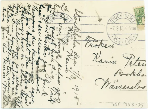 VMSGP00961-54 - vykort adresserat till "Fröken Karin Peterson adr. Herr Georg Bergius Bok & Pappershandel, Vänersborg"