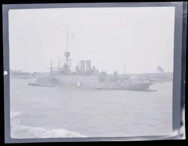Enligt notering: "En Kryssare? o U: Båtar i Marstrands Hammn"