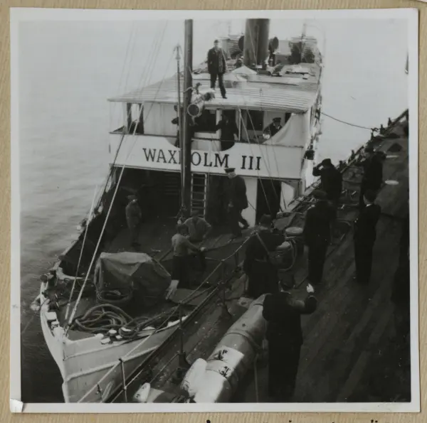 Bilden visar fäjran Waxholm III som har gått långsides vid pansarskepp Sverige. En man går över en planka mellan fartygen.