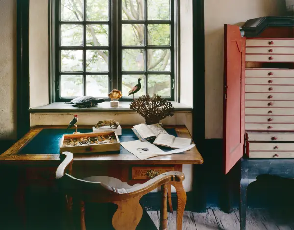 - Bilden publicerad i Helena Harnesks bok I händelsernas centrum med följande bildtext: Linnés arbetsrum i huset i Uppsala. På skrivbordet står bland annat en låda med fjärilar, en uppstoppad fågel och en korall. I fönstret en torkad sköldpadda och en torkad fisk. Till höger ett öppet insektsskåp.