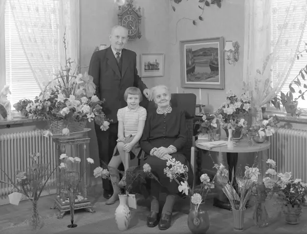 sitter vid vår mormor. Kortet har nog tagits i vardagsrummet på Fredsgatan 10. Vår bostad, där Maggan fortfarande bor."