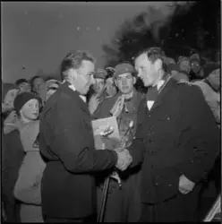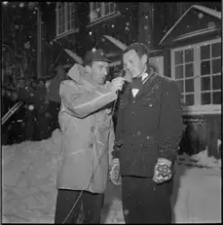 Bilde 12-13 fra venstre: Arne Hamre intervjuer Martin Stokken etter at Magnar Estenstad (skimtes bak) har overlevert Stokken 2.-premien".