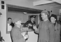 I samme artikkel er også brukt bilde 4 med følgende bildetekst: "Lossegjengens bas Sigurd Aandahl (t.h.) skåler for "Meteor" med gjengens eldstemann, 72 år gamle mottakermann Andreas Hermannsen, mens restrauratør Wiggen skjenker ut til resten av den 22 mann sterke gjengen".