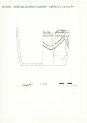 Skår fra et tykkvegget, kvartsmagret leirkar med glatt, sort utside, og grå innside. Karet har form som et spannformet leirkar med konveks karvegg. Randen er dårlig bevart, men ser ut til å være ikke fortykket med flat overkant. Dekor under randen av tre horisontale streker, og under disse sidestilte, doble buer. Størsteparten av karet er til stede, og skårene har alle vært sammenlimt. De foreligger nå som tre større stykker sammenlimt av flere skår, samt seks løse skår og avskallinger.
