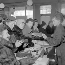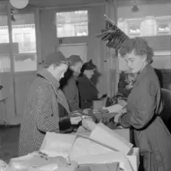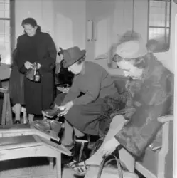 Adresseavisen 19.02.1955 har laget en montasje. Øverst til venstre bilde 1. Til høyre for dette bilde 3. Under disse til venstre, et bilde som ikke er fra denne serien, til høyre bilde 10. Montasjen har følgende bildetekst: "Skobutikkene var helt sprengt under rushet i går, og ekspeditrisene fløy hit og dit i et voldsomt tempo hele dagen".