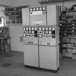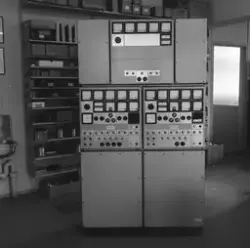Ser ut til å være en tavle for omkobling til reservekraftaggregat med amperemeter, voltmeter og kilowattmåler.