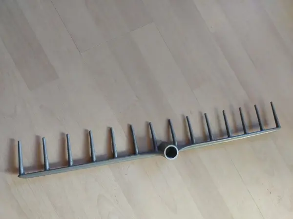 Subject Lättmetallhärv tillverkad vid Nykvarns Lättmetall AB efter 1947. Nykvarns Lättmetall drevs av kusinerna Einar Waldekrantz och Herbert Wadle samt entreprenören E.M Lindstedt. Lättmetallhärven ersatte den traditionella härven av trä med pinnar som skars i rönn trä. Lättmetallen var skör och många härvar hamnade i skrotlådan även efter lätt slag mot sten eller jord.
