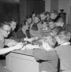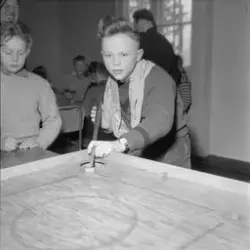 Nidaros 17.03.1955 har satt sammen en montasje. Øverst t.v. bilde 10, Til høyre for dette, bilde 14. Under disse to bilde 1 t.v. for bilde 6. Montasjen har følgende bildetekst: "Mens karene venter på snekkerverktøy til hobbykveldene på Åsveien gamle skole, bruker de tida til å skjerpe hjernecellene. Vidar Teien og Knut Knutsen sitter fordypet i sjekkbrikkenes framrykkinger, mens Steinar Johnsen, Bjørn Skagen og Terje Smistad spiller galoppspill. Lederne, Svein Nilsen, Kåre Kvernrød og Per Nilsen planlegger til neste gang mens liflige saksofontoner lyder fra bakgrunnen".