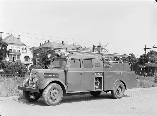 Vogn nr. 1 - DB 1. Fikk siden et registreringsnummer med F- (Drammen-registrert med Buskerud sin bokstav). Øvre delen av brannbilen ble siden malt hvit.