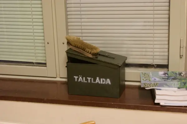 Tältlåda på fönsterbräde. Numera innehåller den skovårdsmateriel.