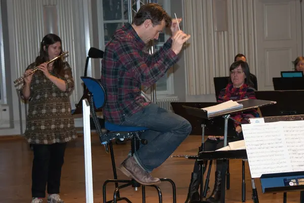 Rep av Marco Pützs flöjtkonsert Concerto for flute and band. Från vänster: Katja Wisén, soloflöjt, Fredrik Burstedt, dirigent denna produktionsvecka (jobbar vanligtvis som konsertmästare i Helsingborgs symfoniorkester kombinerat med att dirigera orkestrar. Han är väldigt musikalisk.), Sabine Jönsson, flöjt/piccolo, Jonatan Olofzon, horn (vikarie) & Emma Widengård, horn. Ur genusperspektiv så har vi det senaste decenniet enbart haft två kvinnliga dirigenter, båda ett par tillfällen var. På 1990-talet hade vi en dirigenttävling där två kvinnliga dirigenter var i final. De jobbar inte som dirigent idag. Vi känner till en etablerad svensk kvinnlig dirigent, men hon har aldrig dirigerat oss. Det tycker jag är synd.