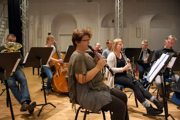 Musiker från vänster: Anders Hårstahaugen, eufonium, Emma Josefsson, kontrabas (vikarie), Carina Johansson, essklarinett, Nils-Olof Friberg, basklarinett, Curt Blomgren, klarinett, Elin Fleischer, klarinett (vikarie), Bengt Martinsson, klarinett samt Gunnar Magnusson, klarinett (vikarie).