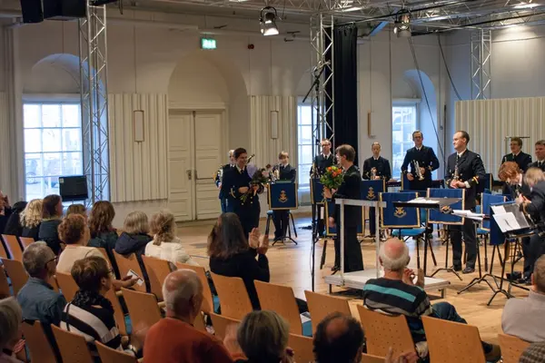 Publik främre raden från vänster: Michelle Martinez, Jenny Hammar, Malin Klintin, Marie Andersson och Emilie Abrahamsson sen är det tre mig okända personer. Orkestern: Karin Brodin, horn, jag, Katja Wisén, soloflöjt, Emma Widengård, horn, Jonatan Olofzon, hornvikarie, Fredrik Burstedt, dirigent och bakom honom Sabine Jönsson, flöjt, Magdalena Nilsson, trumpetvikarie, Peter Meijer, trumpet, Marcus Bauer, oboe, Carina Johansson, essklarinett böjer sig fram, Per Fastrup, trumpetvikarie, Gunnar Magnusson, klarinettvikarie ser också ut att buga samt Peter Sarrin, saxofon.