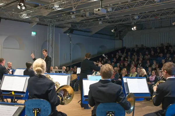 Från vänster: Marcus Bauer, oboe, Gunnar Magnusson, klarinett (konsertmästarvikarie), Sabine Jönsson, piccola, Karin Brodin, horn, Fredrik Burstedt, dirigent, fullsatt Sparresal idel okända i publiken, jag (Katja Wisén) stående spelande soloflöjtstämman, Emma Widengård, horn, i publiken precis bakom mikrofonen min älskade tillika förra scenmästaren på Marinens Musikkår Johan Sjöström, våra två barn, 7 och 5 år, min Mamma, på första parkett Emilie Abrahamsson, Marie Andersson, Malin Klintin, Jenny Hammar och Michelle Martinez och längst till höger i bild hornvikarien Jonatan Olofzon.