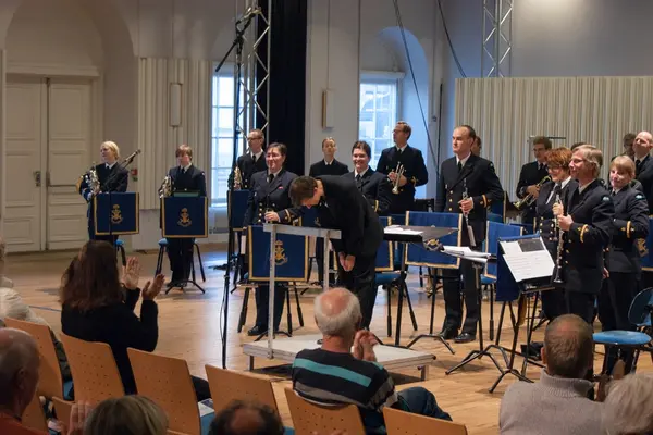 Marinens Musikkår tackar för applåderna från vänster Karin Brodin, horn, Emma Widengård, horn, Jonatan Olofzon, hornvikarie, Sabine Jönsson (med röd medalj), piccola, bugande Fredrik Burstedt, dirigent, Magdalena Nilsson, trumpetvikarie, Katja Wisén, flöjt (i fönstret syns vår lastbil) Peter Meijer, trumpet, Marcus Bauer, oboe, Bo Ågren, trumpet anas, Per Fastrup, trumpet, Carina Johansson, essklarinett, Gunnar Magnusson, klarinettvikarie, Elin Fleischer, klarinettvikarie, Ulf Sigurdsson, fagott samt Lars Hedlund, trombon.
