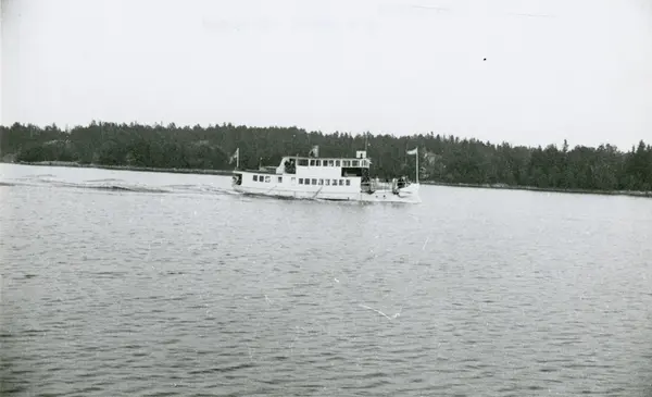 Passagerarfartyget Gurli av Lidingö under gång i Stockholms skärgård.I bakgrunden syns ön Yxlan.