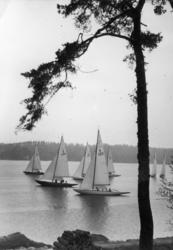 Övrigt: Från KSSS poängseglingar i Saltsjöbaden 1-2 juni 1940. Förutom 5-S23 RIMA ses fr v t h 5-S38 VIVIAN IV, 5-S45 DOTTE, 5-S7 ROULETTE IV (ex TOJE), RIMA, 5-S1 TRIONA samt, t h om tallen, 5-S10 LA FEMME och 5-S22 MAUSSI. Anteckningen på fotots baksida är missvisande; bilden föreställer inte Juniregattan 1940 utan KSSS poängseglingar i Saltsjöbaden det året; 5-S7 ROULETTE IV medverkade endast i Poängseglingarnas första omgång 1-2 juni (båten uteblev 8-9 juni) och deltog över huvud taget inte i Juniregattan den 16 juni.