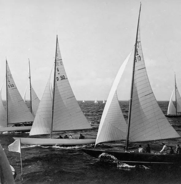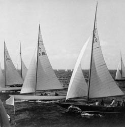 Övrigt: Förutom 6-S13 MARIANNE ses på denna bild de danska 6-D50 DO-DO (b. 1934, konstr. Bjarne Aas) och 6-D52 DANIA (b. 1936) samt längst t h 6-S30 VIVIAN (b. 1935, konstr. Bertil Bothén; urspr. GKSS-35, senare SVENSEXAN, GAZELLEN). Spekulationen i baksidesanteckningen om tiden för bildens tillkomst saknar grund; det enda tillfälle dessa båtar gemensamt deltagit i någon segling i KSSS regi var vid Sandhamnsregattan juli-augusti 1937.
