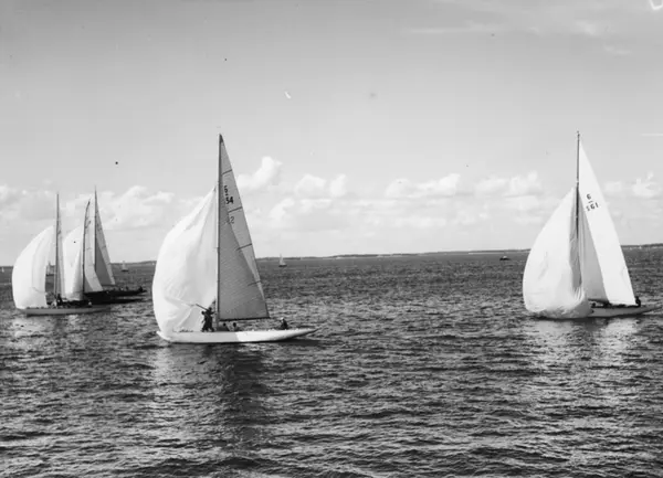 Övrigt: Från Sandhamnsregattan 30 juli 1950. MAY BE VI (senare CINDY LOU, YOU TOO, CHAO, numera åter MAY BE VI i Finland med segelnummer 6-L51) är båten med vitt skrov i förgrunden. Båten längst t h, som enligt baksidesanteckning påstås vara Elisabeth II, är i verkligheten 6-S61 ALIBABA II (b. 1948, konstr. Tore Holm). Segelnumren på båtarna t h i bild går inte att tyda.