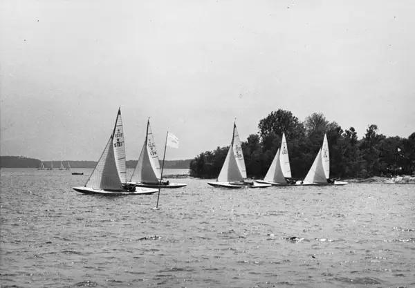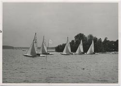Övrigt: Från neptunkryssarnas segling under SS Brunnsvikens Saltsjöregatta 1947 (detta år sammordnad med KSSS Juniregattan), starten vid Trälhavsgrunden 14 juni. S121 MONICA III är främsta båt; därefter följer S28 HELENE (skymd; b. 1942), S125 GULLAN X (b. 1947), S103 ATTACK (b. 1945) och S9 PETER (b. 1942). Fotografiet återgivet i KSSS årsbok 1948 s 98.