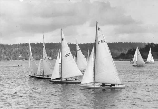 Övrigt: Från KSSS poängseglingar på Baggensfjärden hösten 1949. I KSSS årsbok 1950 s 79 är denna bild placerad så att den illustrerar referaten av antingen vårens poängseglingar eller Juniregattan; en jämförelse med seglingsprotokollen och segelnumren på bilden visar dock att fotografiet tagits under höstens poängseglingar, som ägde rum 4 september. Fr v t h ses oidentifierad båt, 637 TOUAOUMOA (b. 1929), 2168 STARDREAM (b. 1943), 904 VÄSTAN (skymd; b. 1932) och 1798 LOTTA IV (b. 1935). Båtarna i bakgrunden t h har inte kunnat identifieras. Fotografiet återgivet i KSSS årsbok 1950 s 79.