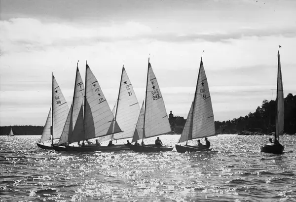 Övrigt: Från Skolungdomens höstseglingar i Saltsjöbaden 1947, Baggensfjärden fredagen 19 september. De stjärnbåtar som kan identifieras är fr v t h 318 NEBBE (skymd), VING 1 (skymd), 271 AMIGO, 21 GLIMT (skymd), 242 TRIX och 183 LATTJO. Båten längst t h kan på fotografiet inte identifieras med hjälp av segelnumret, men en jämförelse med alternativexponeringen Fo133734 visar att det torde röra sig om 280 BLUMS II. Noteras kan närvaron av vingbåten (= finska stjärnbåten) VING 1 från NJK; liksom flera av de andra båtarna på bilden återfinns inte denna i protokollet från finalseglingen följande söndag (KSSS årsbok 1948 s 210). Fotografiet återgivet i Till Rors årg. XIII (1947) nr 40 s 14, i beskuret skick även i KSSS årsbok 1948 s 137. Alternativexponering i KSSS-samlingen Fo133734. Jfr även KSSS-samlingens Fo133765, som är taget vid samma tillfälle.