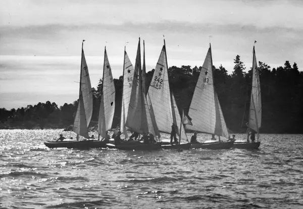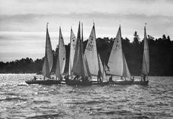 Övrigt: Från Skolungdomens höstseglingar 1947 på Baggensfjärden, vid Sumpholmen 19 september. Årtalet framgår vid jämförelse med segelnumren i protokollen från skolungdomsseglingarna under det sena 40-talet; de båtar vars identitet kan urskiljas är 318 NEBBE, 240 SALTKRÅKAN, 21 GLIMT, 242 TRIX, 183 LATTJO och finska vingbåten VING 1. Jfr KSSS-samlingens Fo133733 och Fo133734. En annan kopia av denna bild återfinns i Oscar Norbergs samling som Fo54331.